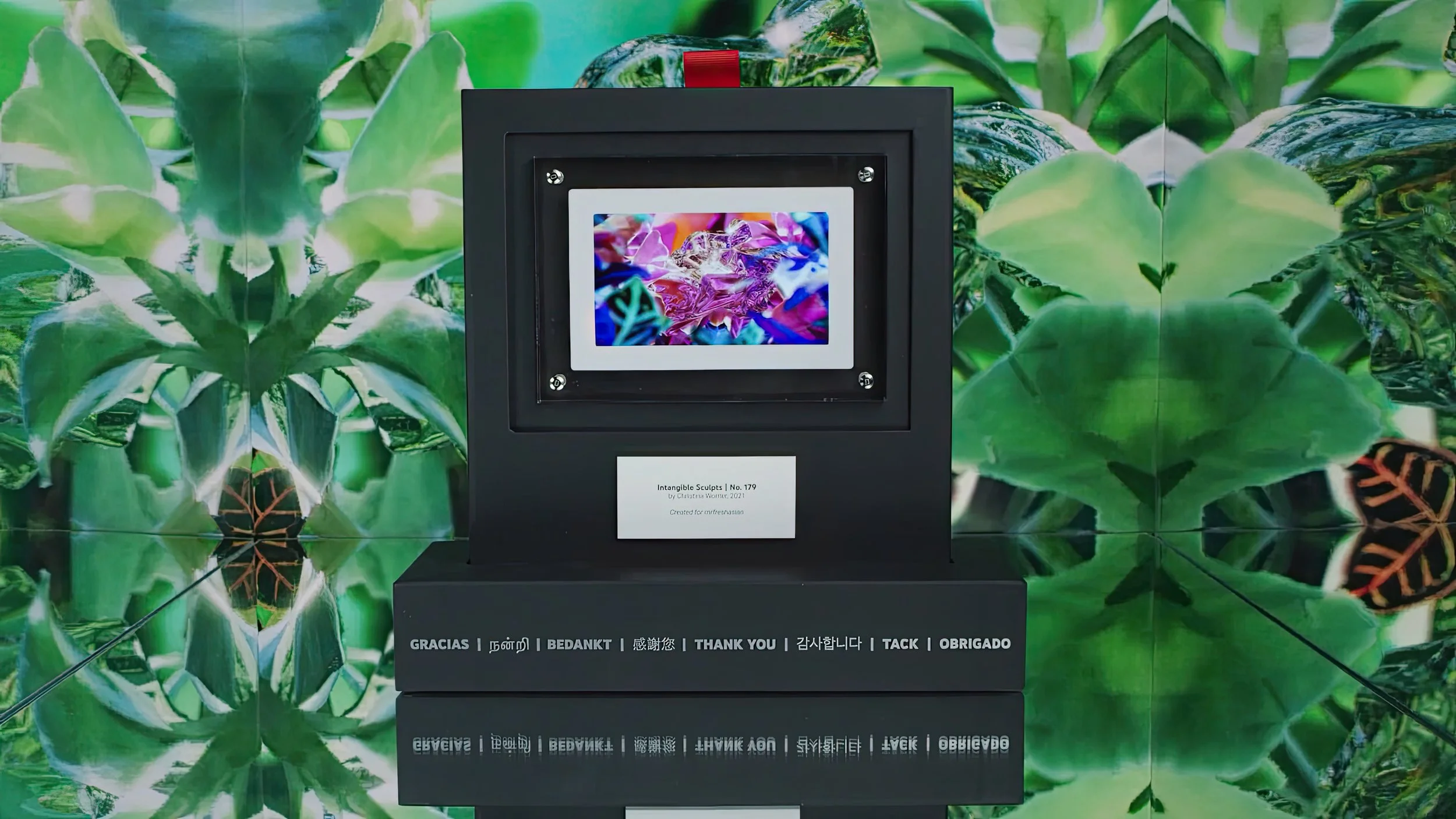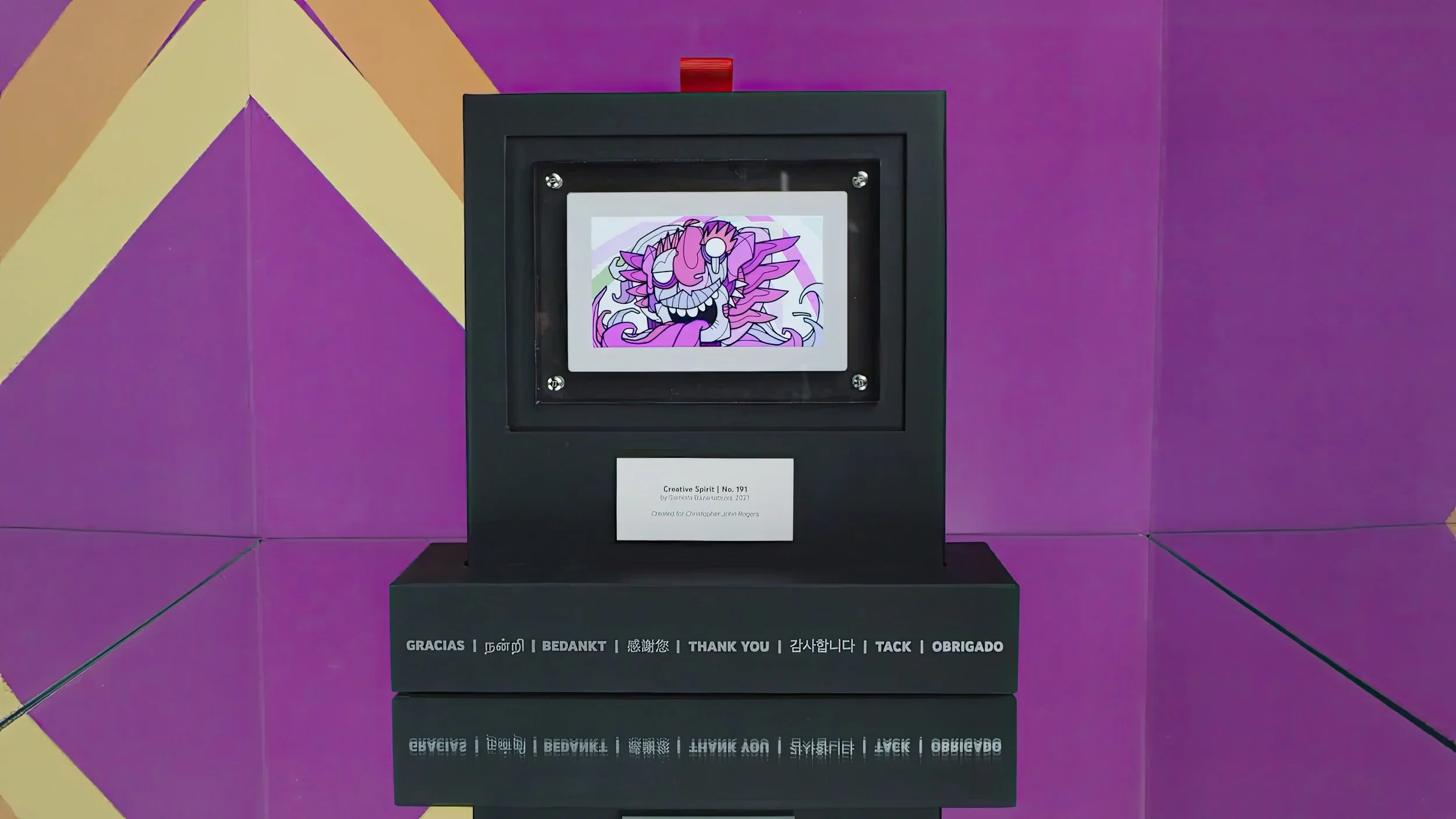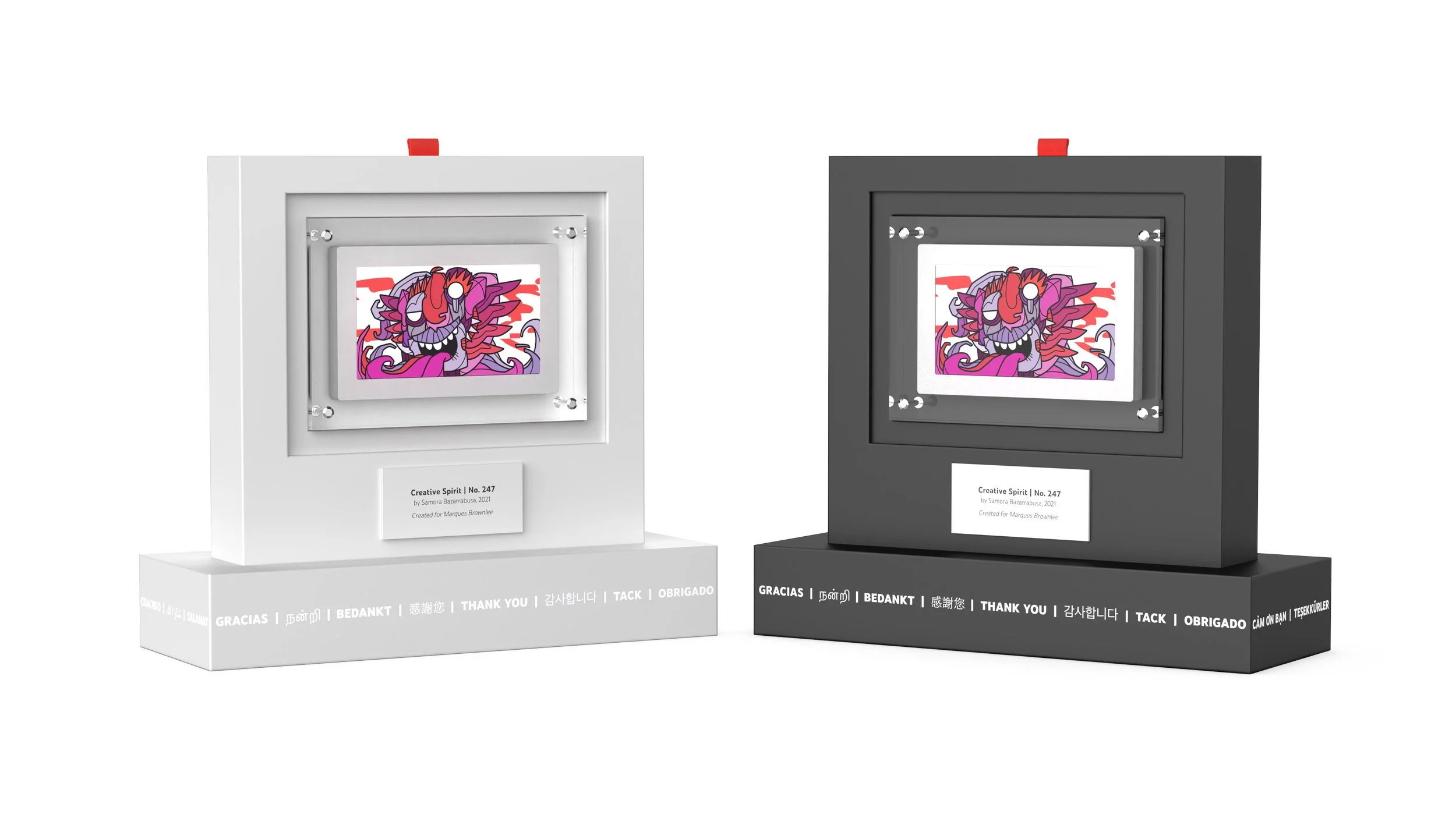 The output of this algorithmic process is titled On Being a Creator, a limited-edition NFT-based physical art collection of 1,250+ remixed, one-of-a-kind works of art. Each piece was minted on the FLOW blockchain and delivered to each creator as an NFT. Partnering with Infinite Objects, a video version of each creator’s NFT was encased in a museum-quality frame. The gifts were shipped in a custom-designed box that converts into a mantel for creators to proudly display their inspiring, new, personalized art.
